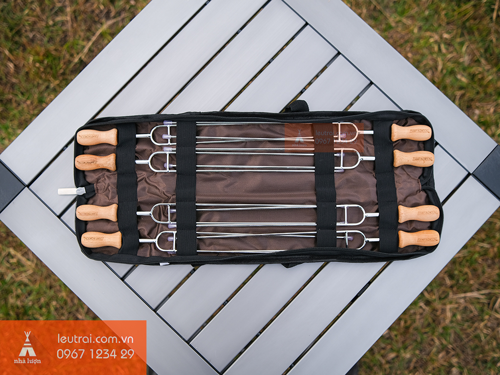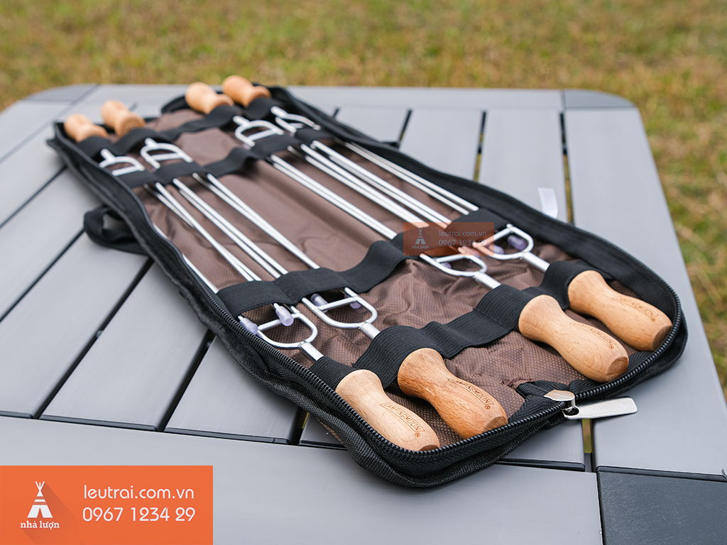 Phần tay cầm với chất liệu gỗ sồi có khả năng không ngấm nước, hay mục nát giúp cách nhiệt tốt, người dùng dễ cầm nắm, độ bền cao ngoài ra bộ xiên nướng có thêm túi đựng riêng tiện dụng.