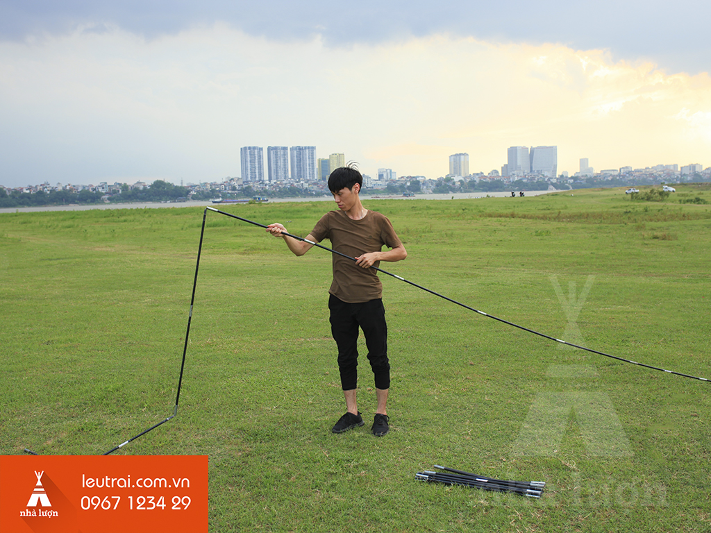 Bước đầu tiên, lắp các đoạn khung lại thành khung lều, chúng ta sẽ lắp được 2 bộ khung dài