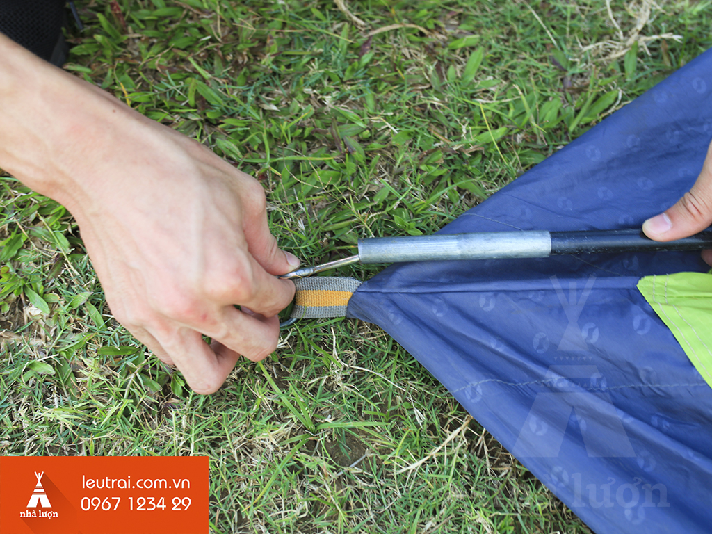 Bước 4, gài đầu khung lều vào chốt giữ ở góc lều, các bạn cắm que sắt vào khung lều, chứ không cắm khung lều xuống đất nhé (nhiều người hay bị nhầm cắm xuống đất lắm)