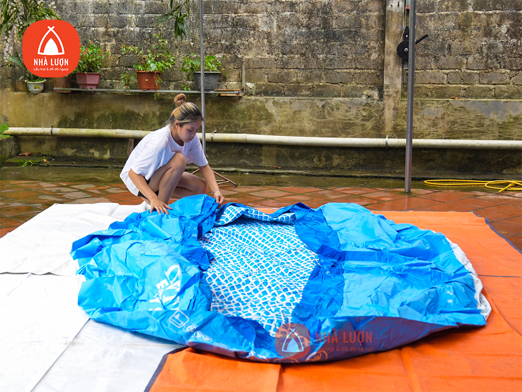 Đầu tiên, dọn sạch nền và trải bạt lót, sau đó trải bể ra