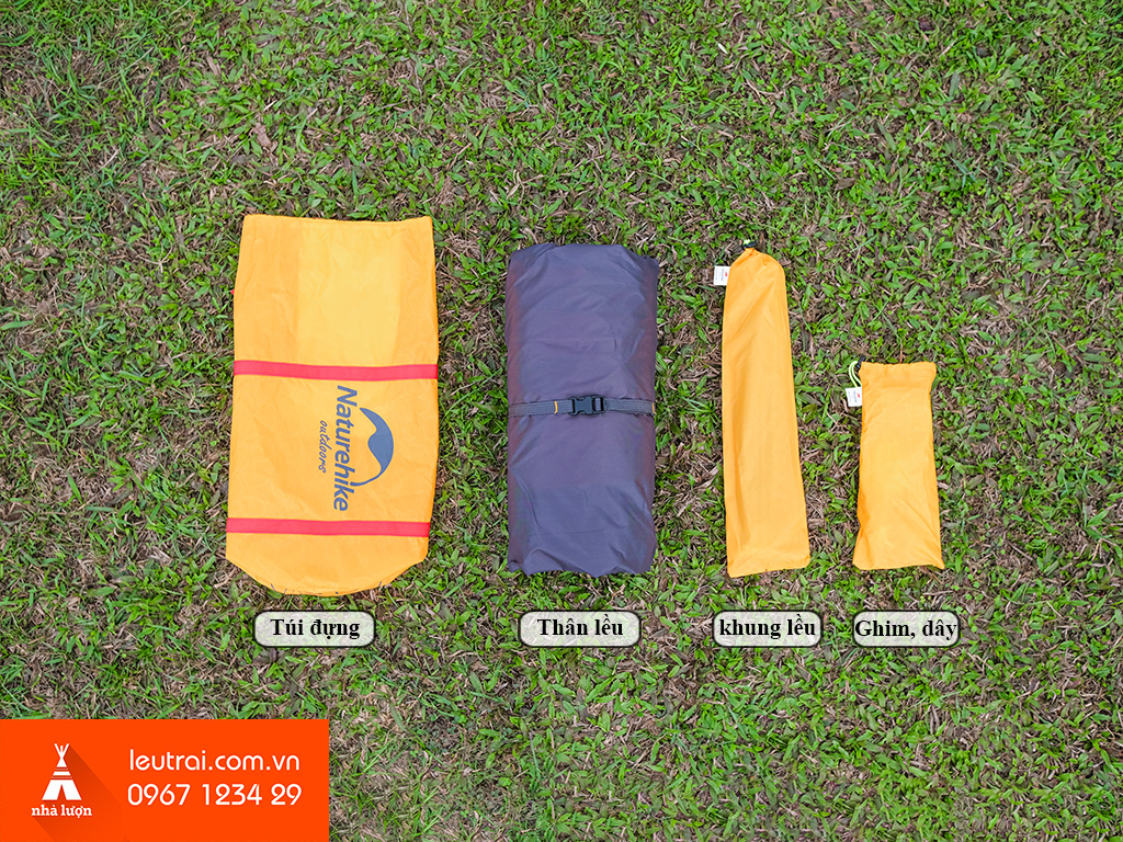 Trọn bộ lều Naturehike: túi đựng, cọc ghim và dây níu, khung lều, tấm phủ che mưa, thân lều