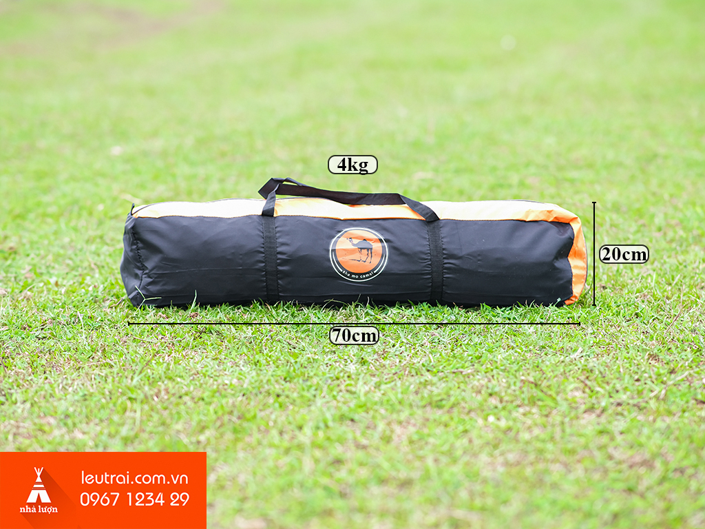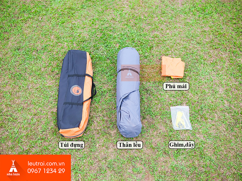 Bộ sản phẩm gồm: Túi đựng, lều, tấm phủ chóp lều, cọc ghim và dây
