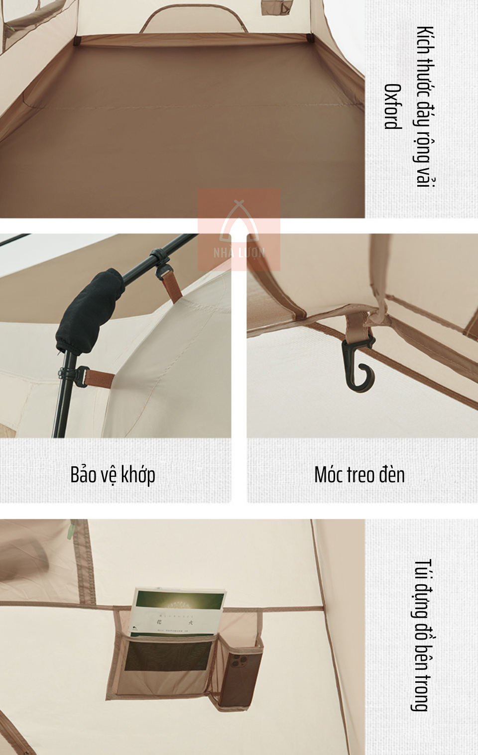 Phần khung lều sẽ có lớp bảo vệ các khớp và trong lều có móc treo đèn và túi đựng đồ tiện dụng