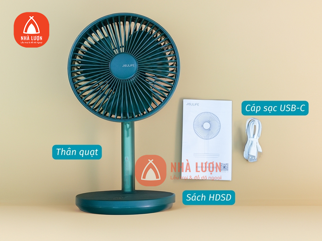 Mở hộp chúng ta có: Quạt tích điện Jisulife FA13P, Sách HDSD, và sợi cáp sạc USB type C