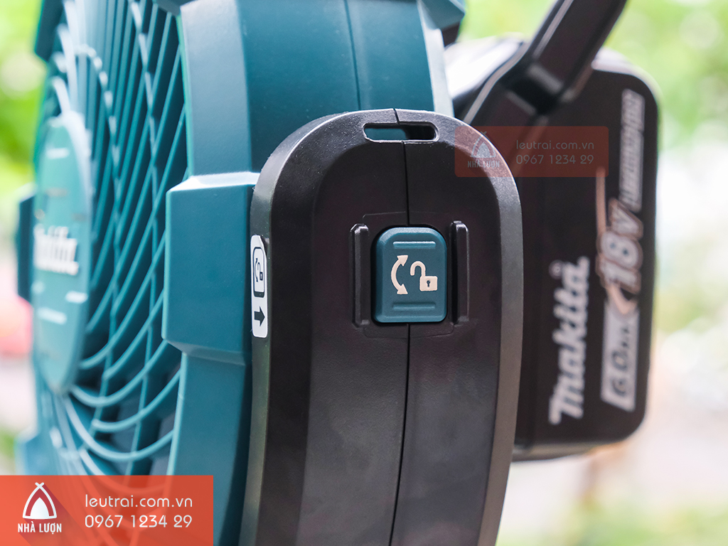 Quạt có thể xoay qua lại, đổi góc chếch lên xuống tiện lợi bằng cách giữ nút khóa bên hông để điều chỉnh