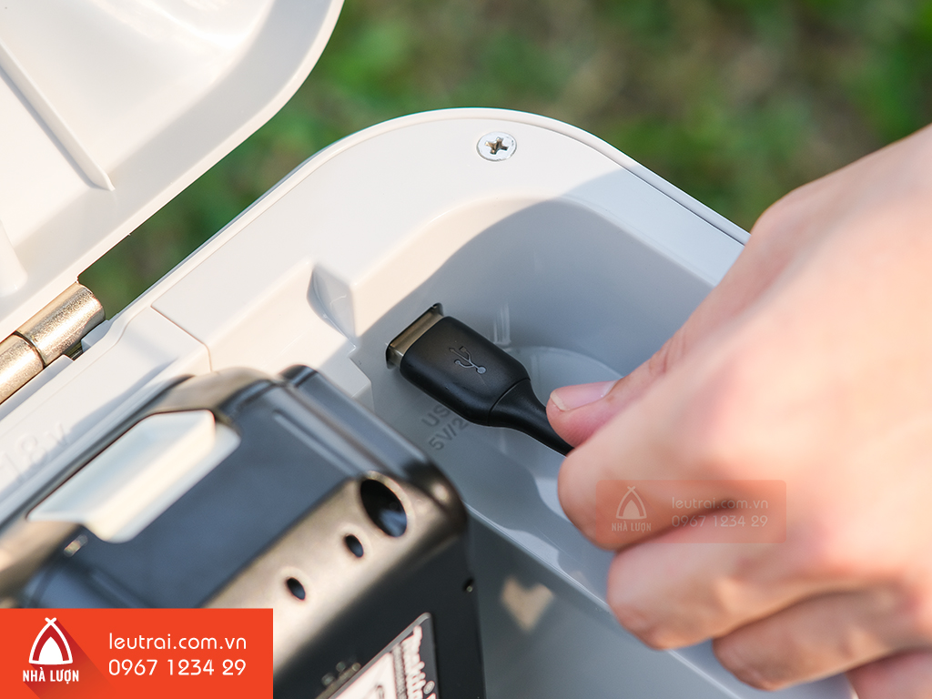 Bánh xe kéo và cổng cấp nguồn khi không dùng pin (sử dụng điện lưới hoặc điện trên ô tô qua các bộ cấp nguồn đi kèm)